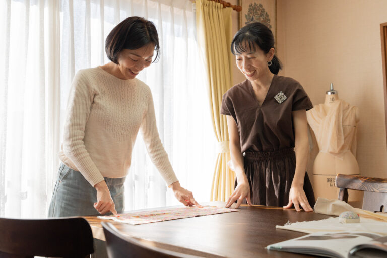 はじめての着物リメイクで、どこから手をつけていいのか、わからなかったのですが、型紙作りから柄あわせまで、ていねいに教えてもらうことができ、作品を完成することができました。